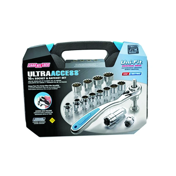 This 16 piece pass-through uni-fit socket set is from Channellock. The drive size is 3/8-inches. All pieces in the set have a chrome finish. The low profile offset handle allows for work in tight spaces and provides maximum hand clearance. Comes with a socket extension for deep access. Comes in a durable storage case. Channellock part number 39100.