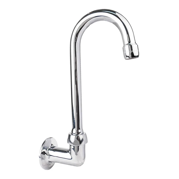This remote rigid / swing gooseneck spout is from Chicago Faucet. It is back mounted and has a chrome plated finish. It has a 2.2 GPM pressure compensating Softflo aerator. Chicago Faucet model 629-E3ABCP.