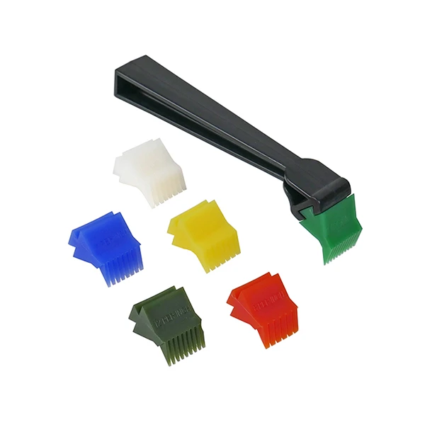 This multi-head fin tool is from Diversitech. It is great for straightening and cleaning condenser and evaporator fins. Each of the nylon heads easily slide into and tighten in the master handle. The heads are designed to fit units with fin spacing of 4-24 fins per inch. The heads are color coded for easy identification. For safety, the heads are angled so that when inserted into the handle it keeps the hand at a safe distance from the sharp fins. Each head can also be reversed in the handle for combing upwards can be done easily with the proper leverage. The master handle has a comfortable grip. Kit comes with master handle and 6 interchangeable head sizes (8, 9, 10, 11, 12, 14). Diversitech part number T-100.