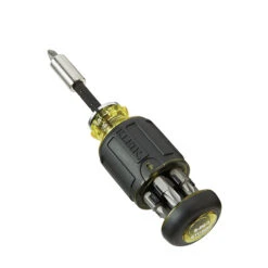 This 8-in-1 multi-bit adjustable stubby screwdriver is from Klein Tools. Driver includes seven different bits and a 1/4 inch nut driver. The industrial-strength bits are conveniently housed within the handle. The compact driver is able to easily reach into tight spots. Adjust the length of the blade for easier access. The impact rated blade can be removed for use as an impact driver attachment. The stainless steel bit holder contains powerful, rare earth magnets for securing bits and fasteners. The cushion grip handle provides maximum comfort. Spring cap allows for optimum and precise control. Klein Tools model number 32308.