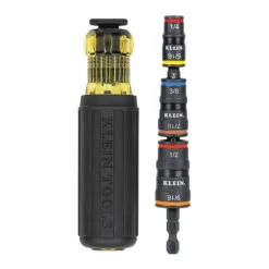 This 7-in-1 impact flip socket driver with handle is from Klein Tools. It includes six integrated hex sizes plus a 1/4 inch bit holding feature. Can quickly and easily change the blade between a screwdriver handle and an impact driver. Includes nut driver sizes of 1/4″, 5/16″, 11/32″, 3/8″, 7/16″, and 1/2″. A multi-function 1/4 inch socket has both shallow (driver) and deep (bit holder) configurations for added versatility. Powerful rare earth magnet securely holds bits and hex head fasteners. Features a 1/4 inch quick connect adapter for easy use with an impact driver. The sockets are color coded for easy identification. Sockets are detachable and allow for easy removal of metal shavings from the magnet. The sockets can be stored on the shaft in any order or orientation. Driver has a patent pending design. Klein Tools part number 32900.