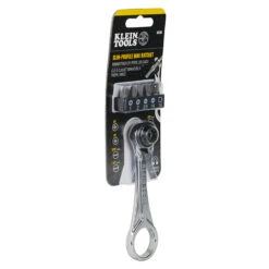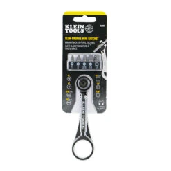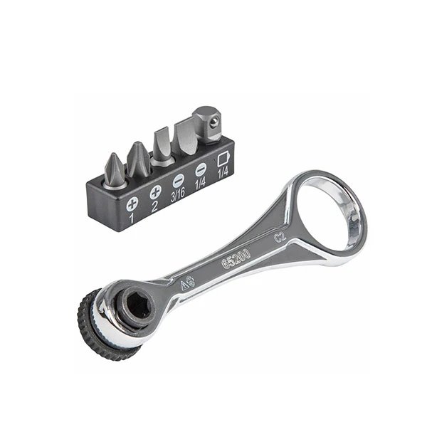 This 5-piece slim-profile mini ratchet set is from Klein Tools. It is the perfect tool for tight spaces. It includes ¼-inch and 5/16-inch nut drivers, a ¼-inch adapter, and four drive bits (#1 and #2 Phillips; 3/16-inch and ¼-inch slotted). The ¼-inch dual-drive head and socket adapter give the tool more versatility. The 72-tooth ratchet only needs a 5 degree sweep for tighter areas. Constructed of high-strength steel, which increases torque and tool life. Has a ring magnet and bit clip for better bit retention. A finger loop provides one-hand driving and convenient storage. Klein Tools model number 65200.