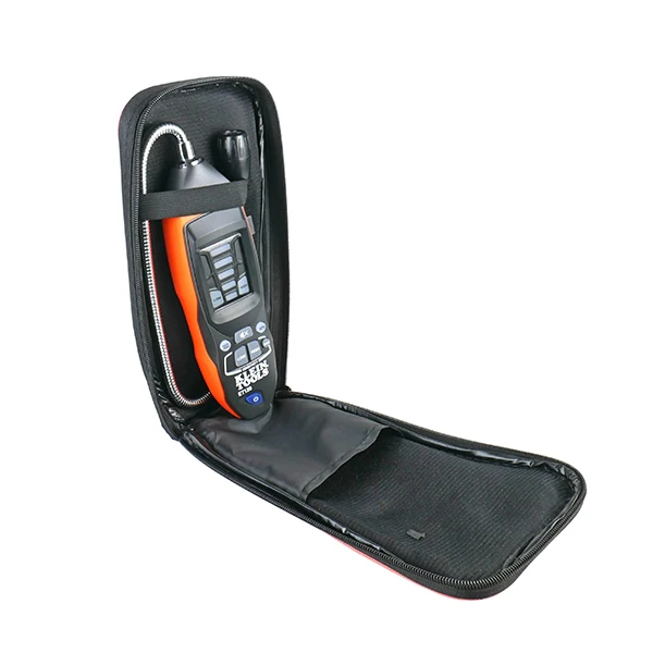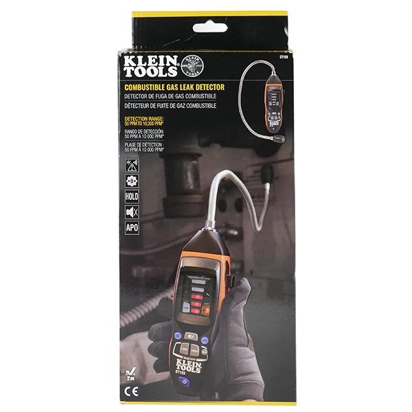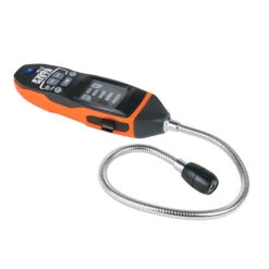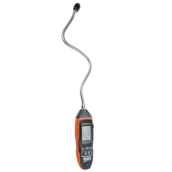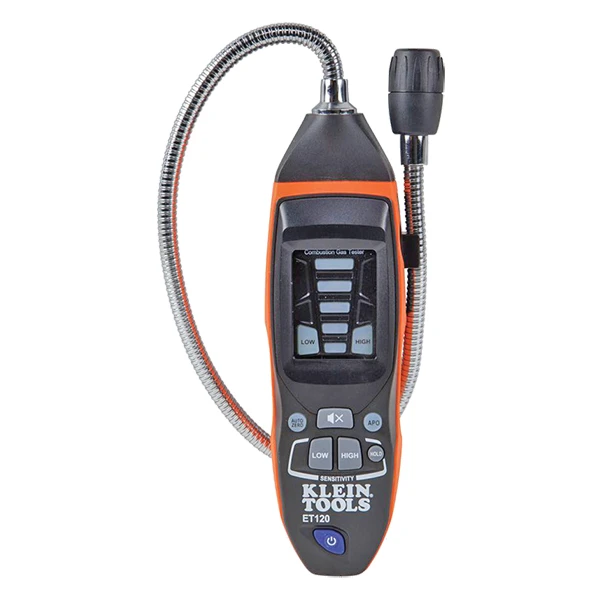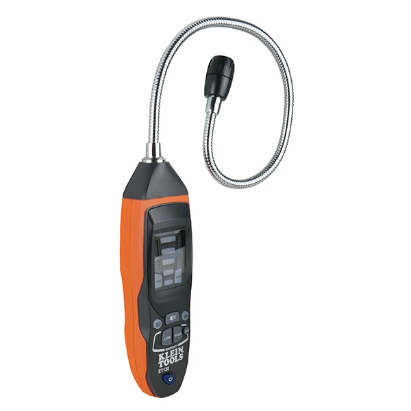 This combustible gas leak detector is from Klein Tools. It has a detection range of approximately 50 to 10,000 ppm* (*based on Methane). Detector has two levels of sensitivity: High (approximately 50 to 1000 ppm) and Low (approximately 1000 to 10,000 ppm). Five red LEDs (visual) and 85dB audible alerts increase as gas concentration grows. It has an automatic zero-point calibration at power-up (lights will flash during self-calibration; this does not indicate the presence of gas). An 18 inch flexible gooseneck expands the sensor’s reach; clips to meter for storage. The over-molded body provides a comfortable grip. After 10 minutes of non-usage the detector will auto-power off to conserve battery life. Comes with 4 AAA batteries, an instruction manual, and a storage pouch. Klein Tools model number ET120.