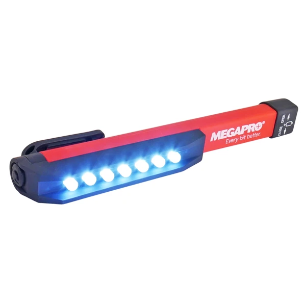 Produces a powerful floodlight effect to see your work! Quality push button on/off switch. Molded clip to stay in your pocket. Water-resistant superior design. Uses 3 AAA batteries to drive 6 super bright white LEDs.