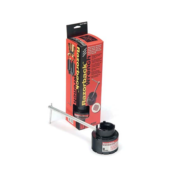 This razorback wrench is from Mill-Rose. It makes installing easy by featuring a unique design that allows for one-handed installation of drains from the top or bottom. Wrench is perfect for retrofits and new installs that are in those tight and hard-to-reach areas. The “T”-handle rotates 180 degrees for easy access and allows for maximum leverage. This tool eliminates the need for all other “box end” wrenches. Will fit most common styles of brass and plastic shower/sink drains. The wrench is made of an extremely durable, high impact polycarbonate polyester material. Mill-Rose model number 73055.