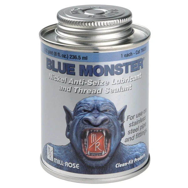This anti-seize lubricant and thread sealant is for use in a high temperature environment. It is a nickel and graphite-based compound composed of pure nickel powder and graphite flake dispersed in a petroleum carrier. Mill-Rose Blue Monster Nickel Anti-Seize will not contaminate catalyst beds, reaction chambers, or special alloy fittings. It provides resistance to chemical corrosion and oxidation at temperatures up to 2600°F (1427°C).