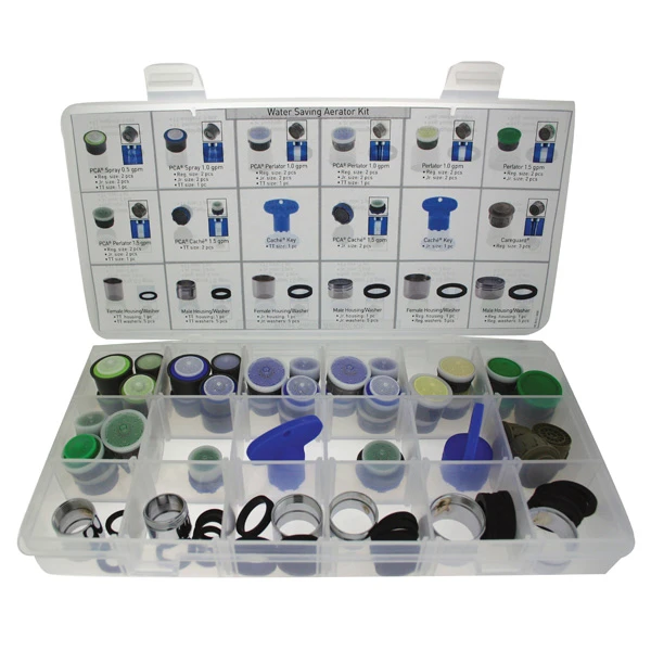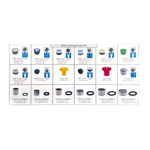 This 77 piece Water Saving Aerator Kit is perfect for upgrading and replacing a variety of water-saving aerators. These aerators come in three sizes, Regular, Junior, and Tom Thumb. The flow range is from 0.5 Gallons Per Minute to 1.5 GPM. This kit includes both male and female threads, and both pressure compensating and flow restricting aerators. It also includes the washers needed to retrofit or maintain any faucet. This aerator kit is a great kit to have on hand for plumbers, facility managers, and maintenance personnel who maintain both commercial and residential locations. All the parts included in the kit are clearly labeled on the cover, including the Cache aerators and keys.