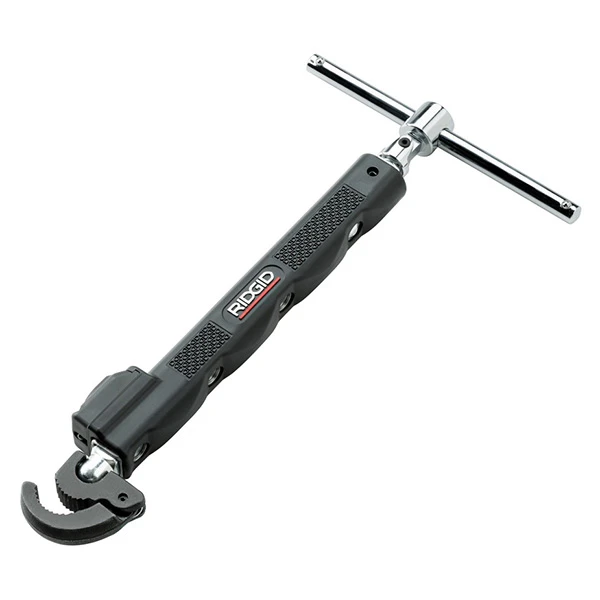 This telescoping basin wrench with built-in LED light is made by Ridgid, model number 46753. It is for use when working with faucet fittings and retaining nuts. The built-in, water resistant LED light has an auto-shut off that preserves the battery life allowing it to last longer. The pivoting T-handle can be removed for easier access into tighter spaces. The 3/8″ square drive connection allows for the use of a ratchet or breaker bar for additional leverage and torque. The ergonomic textured handle increases grip and leverage. Body design allows for telescoping from 10″ to 17″.