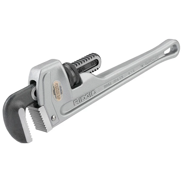 This 12″ aluminum straight pipe wrench is from Ridgid, part number 812. The wrench provides professional strength in lightweight aluminum. It is durable and easy-to-use.