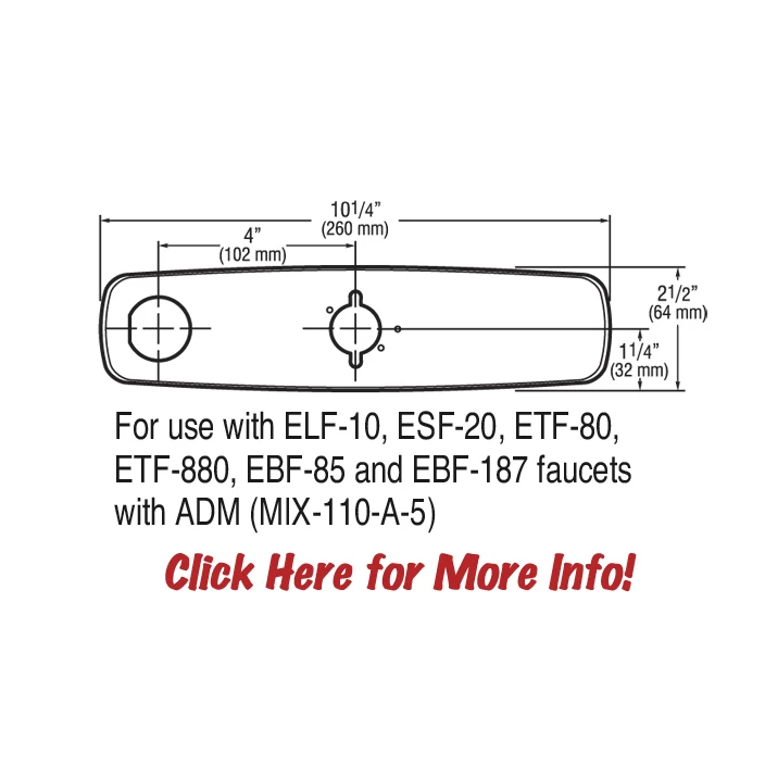 8″ Centerset Trim Plate Kit for EBF-85 or EBF-187 Faucet with optional mixing valve. Includes back-up spacer, self-tapping screw, and CP dual hole trim plate assembly.
