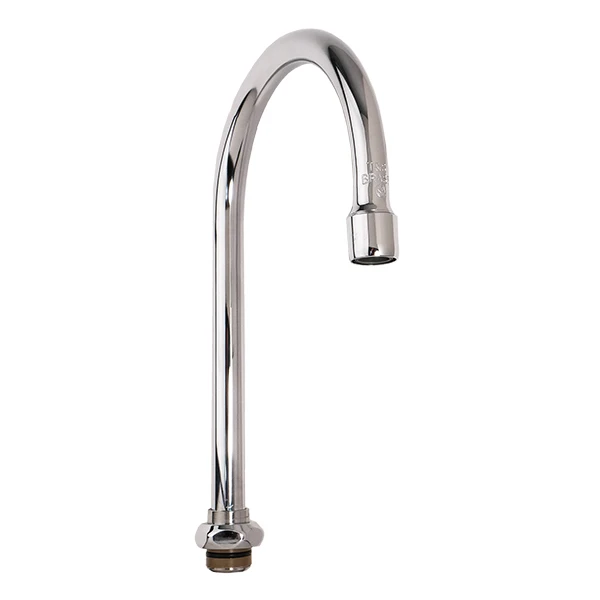 This swivel gooseneck spout is from T&S. It measures 5-3/4″ spread x 8-3/4″ tall. The nozzle has male threads with a stream regulator. T&S part number 133X.