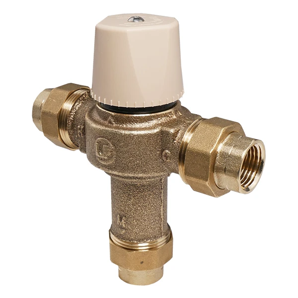 This 1/2″ thermostatic mixing valve with union thread is from Watts Regulator Co. It is designed to limit and maintain mixed hot water. Can be adjusted to the desirable temperature between 80ºF to 120ºF. Utilizes a double throttle design, which controls both hot and cold supplies into the mixed outlet. Both hot and cold inlets have integral filter washers and check valves, which help protect against any cross flow. Watts part number 1/2 LFMMVM1-UT.
