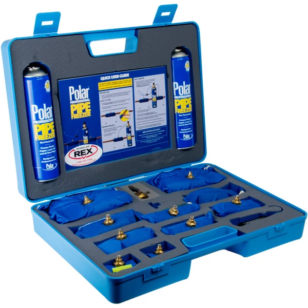 The Arctic Polar System Pipe Freezing Kit is a great kit for facilities to have on hand when turning off the water is a difficult task or there is not time to drain down an entire system to make a repair. The pipe freezing kit is made by Wheeler Rex and works on ⅜” to 2-⅜” pipe. It can rapidly form ice plugs in static water lines that last about 15 to 20 minutes, and can easily be renewed. The kit comes in a carrying case and two jackets for each pipe size to complete double freezes. No additional tools are required to set up and complete a freeze. The parts in this kit are non-toxic, non-flammable and ozone friendly. Shipping weight: 11.5 lbs.